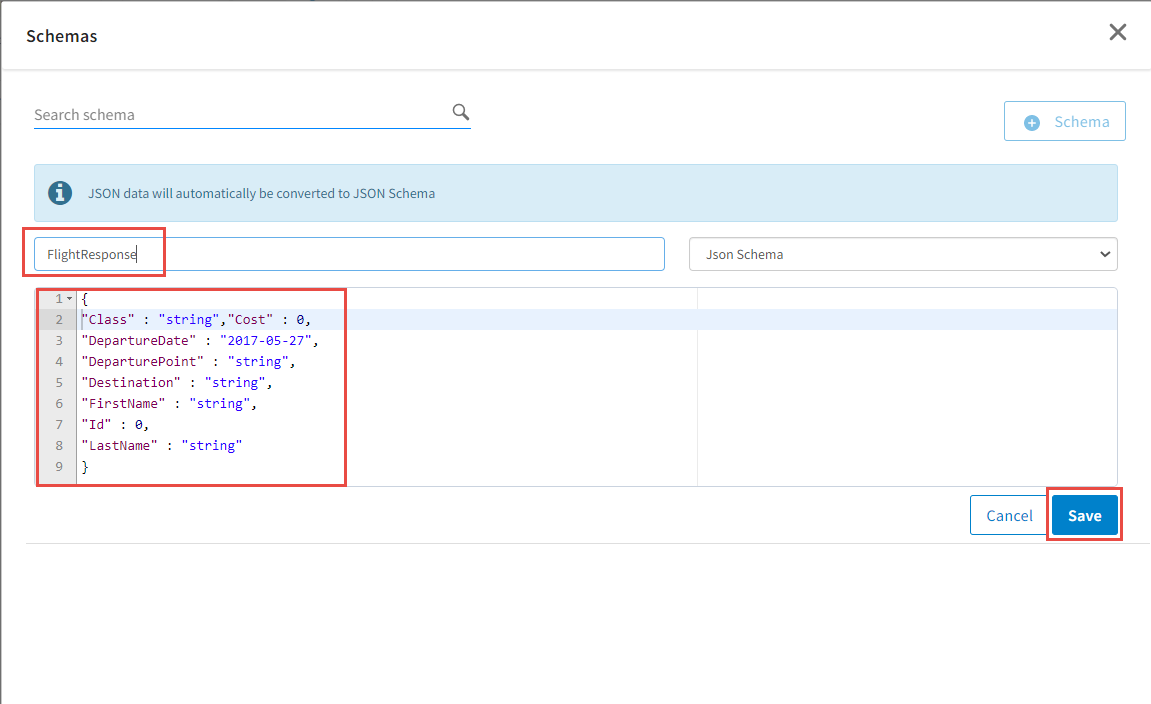 FlightResponseand paste the copied schema into the text editor. Alternatively, if you enter JSON data in the editor, the JSON data is automatically converted to JSON schema.