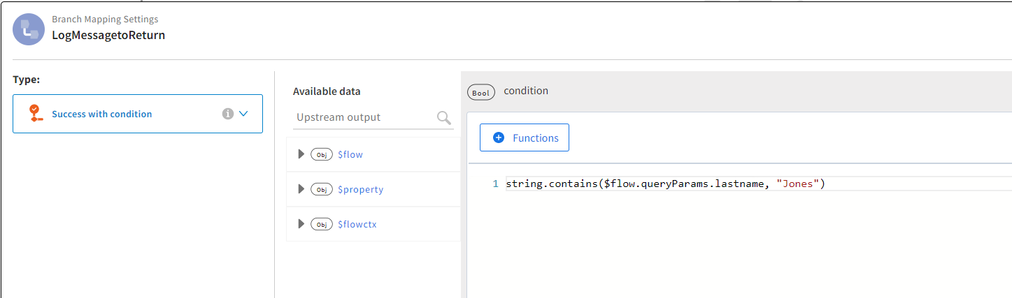 - Select the Success with no matching condition branch condition. If the conditions of all the other Success with condition branches are not true, this branch is run. This means, if the family name entered as a query parameter is not