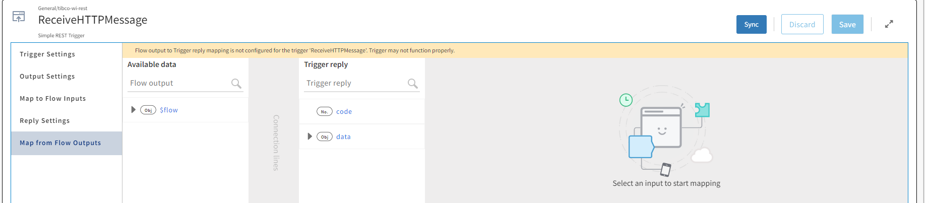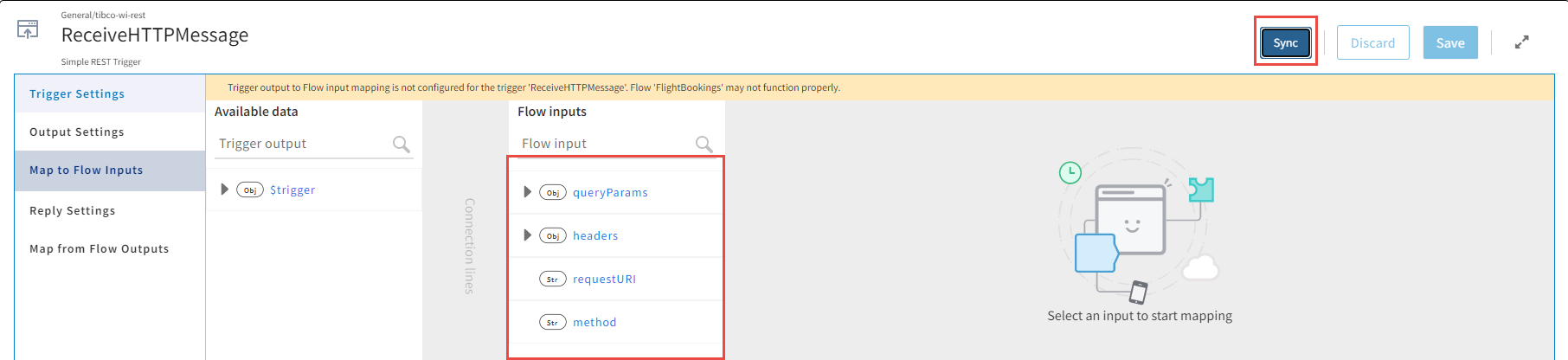 When REST trigger receives a request from a passenger (a REST request), the data from the request is produced by the ReceiveHTTPMessage REST trigger. For the request to be processed, this output must be used by the flow in the form of flow input. Hence, you must map the trigger output to the flow input.