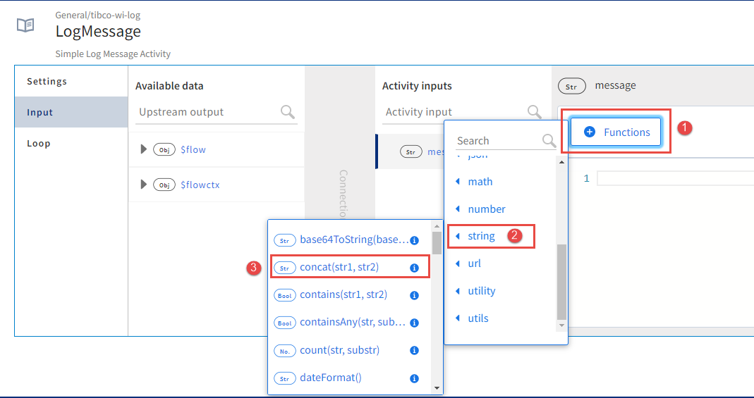 - To configure the message, click Functions, and expand the string. Click concat(str, str2) to add the function to the message box.