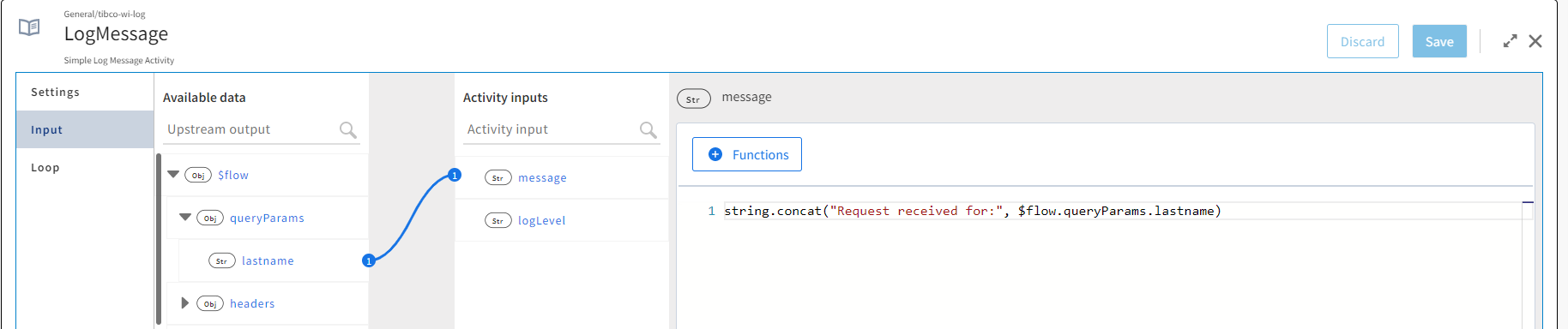- Click the message to open the mapper to the right. Configure a message to be logged by the LogMessage activity when the input from the request that the trigger received is passed on to and received by the flow.