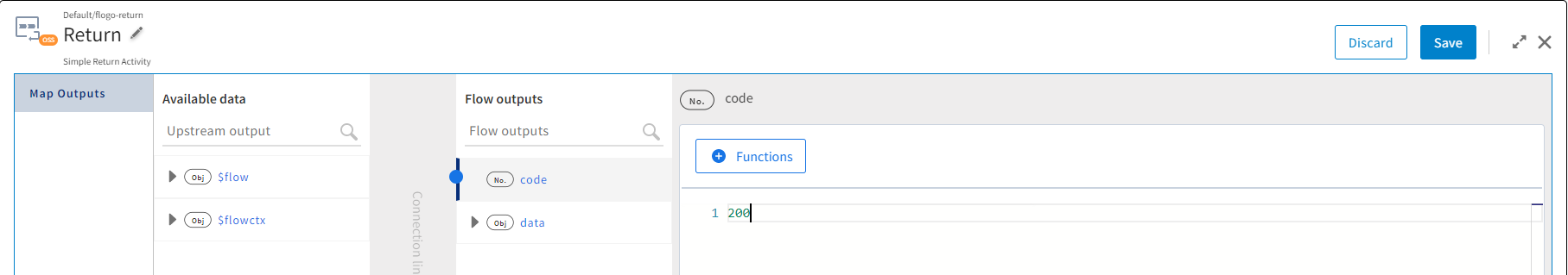 - Click code under Flow outputs to open the mapper and type 200 in the code box, which is the HTTP success code.
