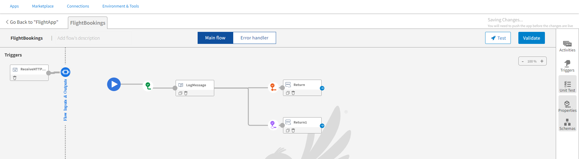 Your app is now ready. Before you push the app to the Cloud, validate all the flows for any errors or warnings. To do so, click Validate. Flogo validates each flow and activity within the flow. For any errors or warnings, you see the respective icons next to the flow name or activity tab, which contains the error or warning.