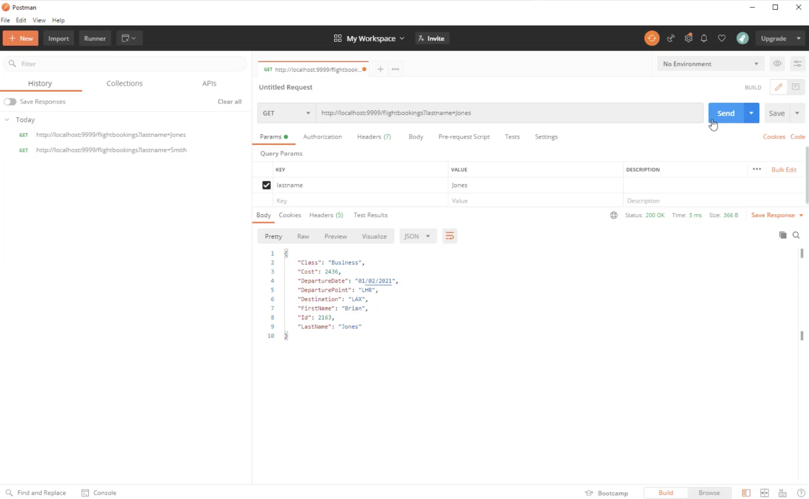 9999, path/flightbookings, and query parameterlastname. For example,http://localhost:9999/flightbookings?lastname=jones.