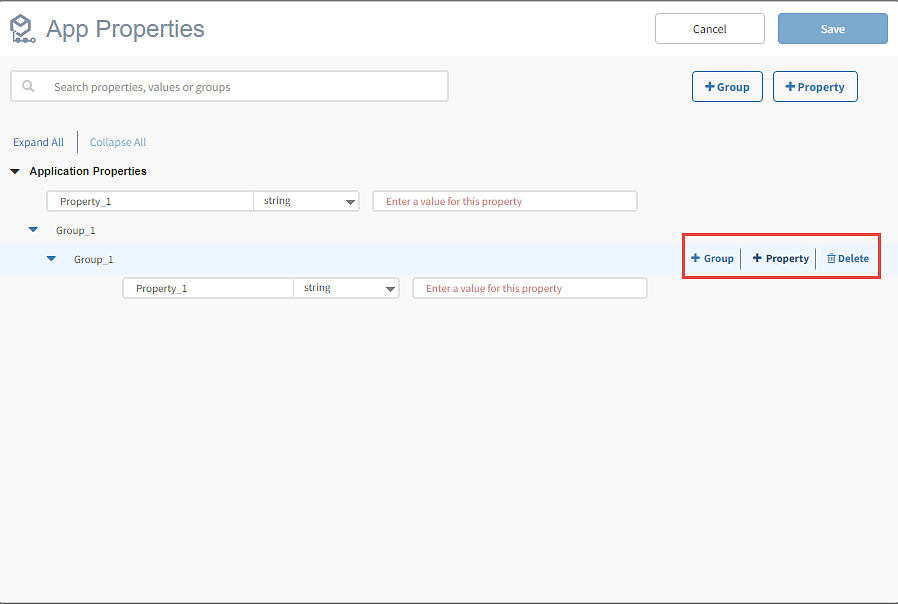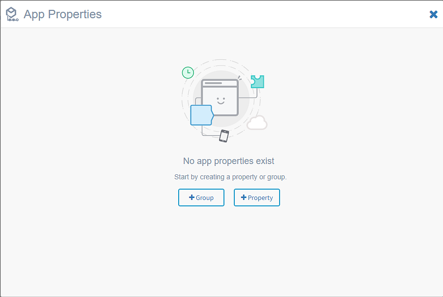 You can view existing app properties for an app in the App Properties dialog box. By clicking on the +Group or +Property, the app properties dialog box lets you add a new group or a property and rename it. An empty app properties' dialog box looks like this:
