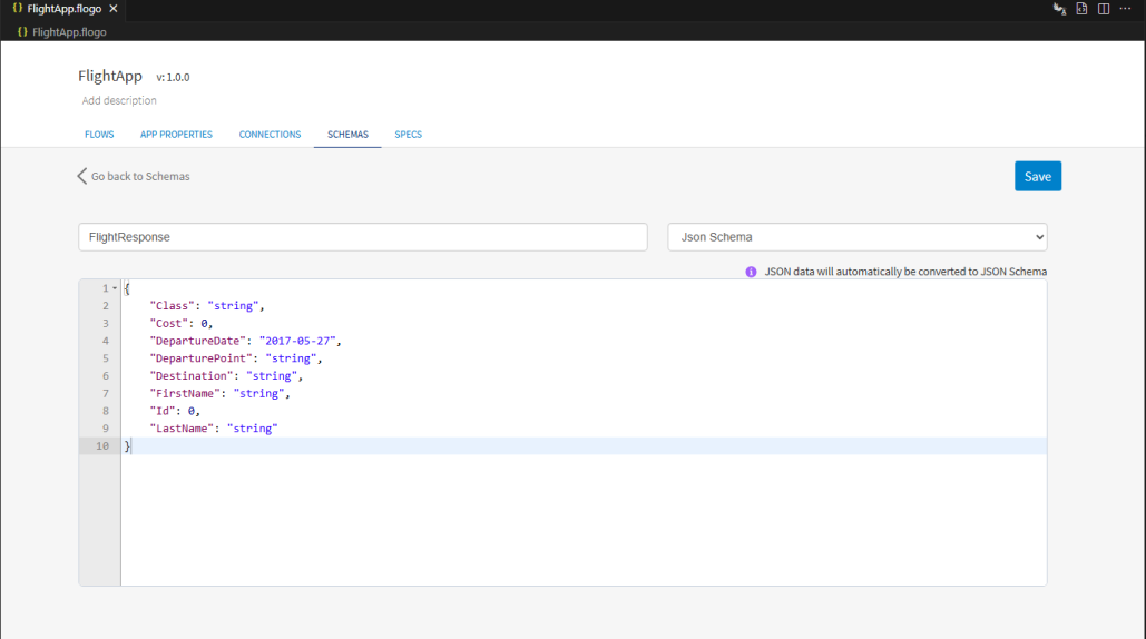 FlightResponseand paste the copied schema into the text editor. Alternatively, if you enter JSON data in the editor, the JSON data is automatically converted to JSON schema.