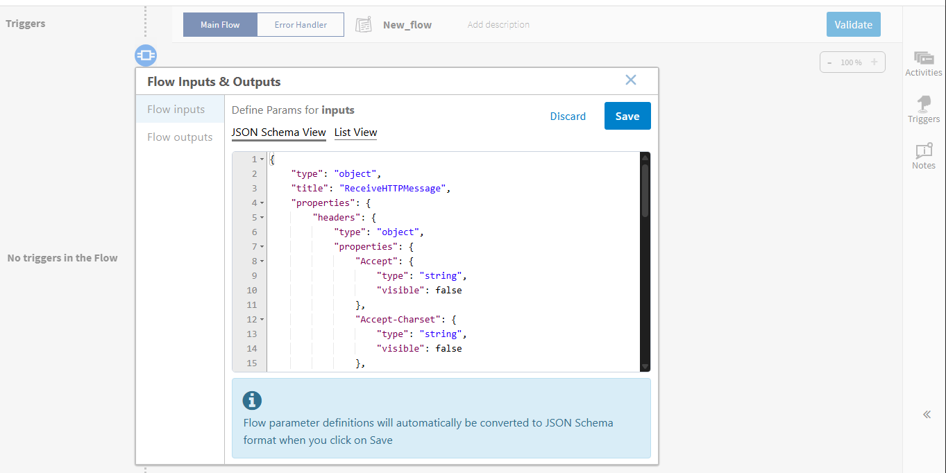 The schema that you entered when creating the trigger is automatically copied to the Flow Inputs & Outputs tab to match the input and output of the trigger.