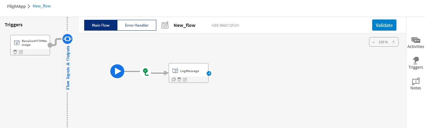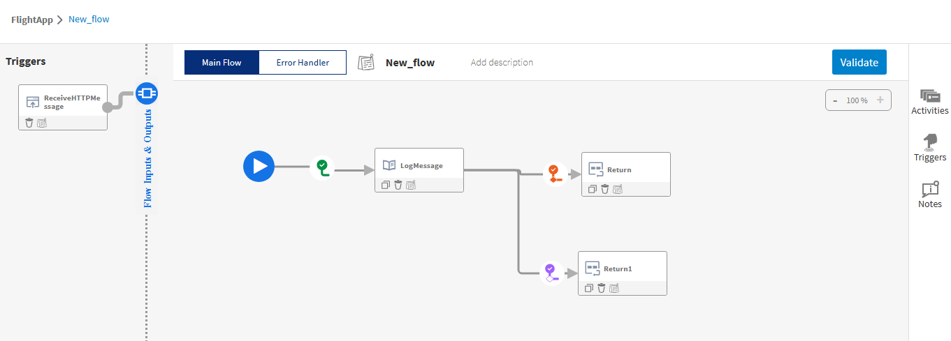 - FlightBookings flow: This flow is attached to the ReceiveHTTPMessage trigger. This flow handles the business logic of the app. In this flow, you must configure a LogMessage activity to log a custom message when a request is received successfully. The LogMessage activity has two success branches:
