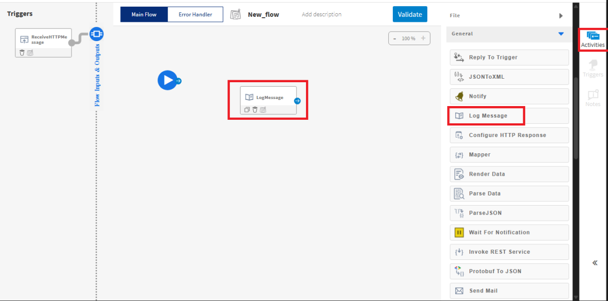 Returnactivity. Hence, we map the flow output to the trigger reply. This mapping is done in the trigger configuration. - Add a LogMessage Activity to the flow and configure a message that the activity must log in to the logs for the app as soon as it receives a request.