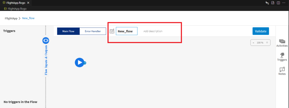 Your app is now ready. Before you push the app to the Cloud, validate all the flows for any errors or warnings. To do so, click Validate. Flogo validates each flow and activity within the flow. For any errors or warnings, you see the respective icons next to the flow name or activity tab, which contains the error or warning.