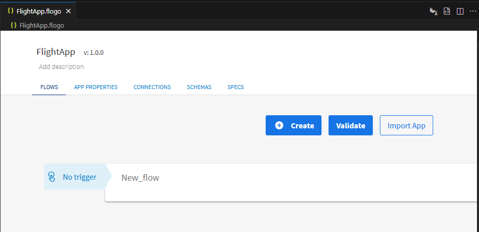 Click Create a New Flogo App, using the Flogo icon available right next to the workspace folder.