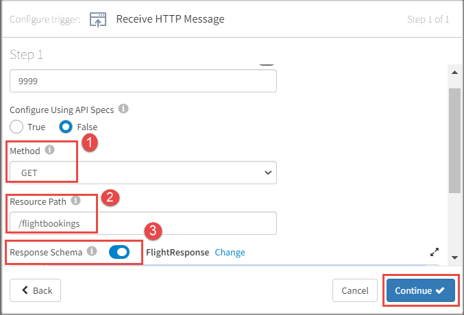 /flightbookingsin the Resource path box. - Enable the Use App Level Schema toggle next to Response Schema to open the Schemas dialog and select the FlightResponse schema you defined earlier.