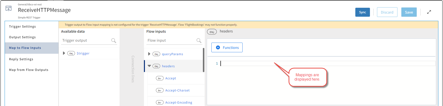 When REST trigger receives a request from a passenger (a REST request), the data from the request is produced by the ReceiveHTTPMessage REST trigger. For the request to be processed, this output must be used by the flow in the form of flow input. Hence, you must map the trigger output to the flow input.