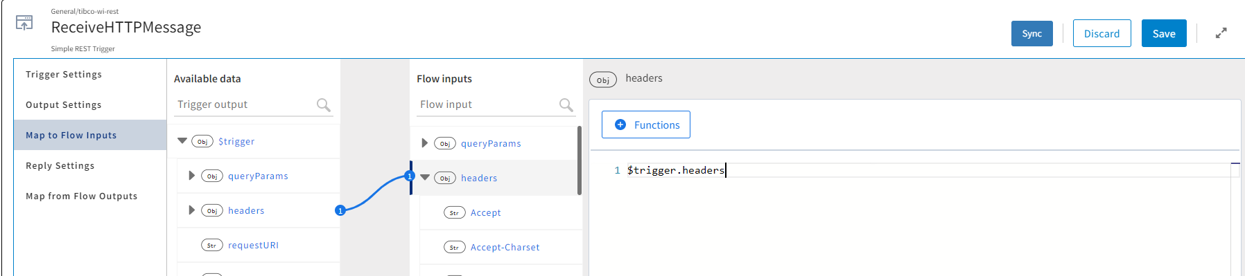 The text editor must now display $trigger.headers and a connection line between the two panes. This indicates that you have successfully mapped the trigger output headers to the flow input header. The numbers at the end of the connection line indicate the total number of mappings for the selected element.