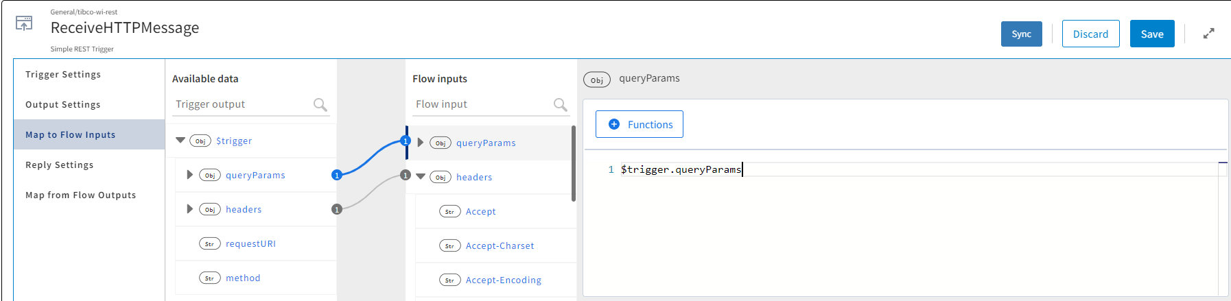 - Save the trigger configuration and click Sync to display the new values. Now, queryParams must open in the Flow inputs column.