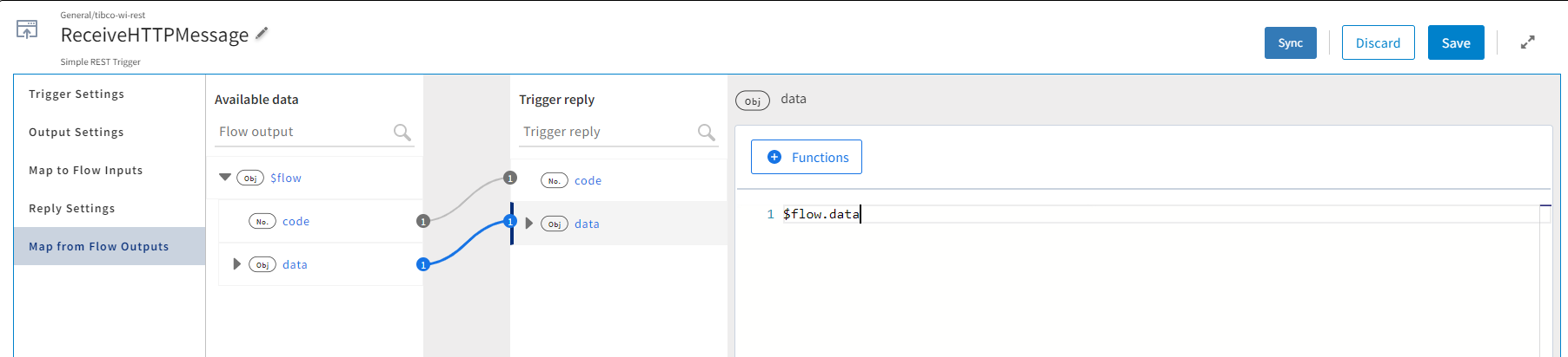 When the execution of the flow is completed, the output must be sent back to the trigger for the trigger to send a reply to the REST request initiator. Hence, the flow output data must be mapped to the trigger reply, which then returns the result of the flow execution to the REST request initiator.