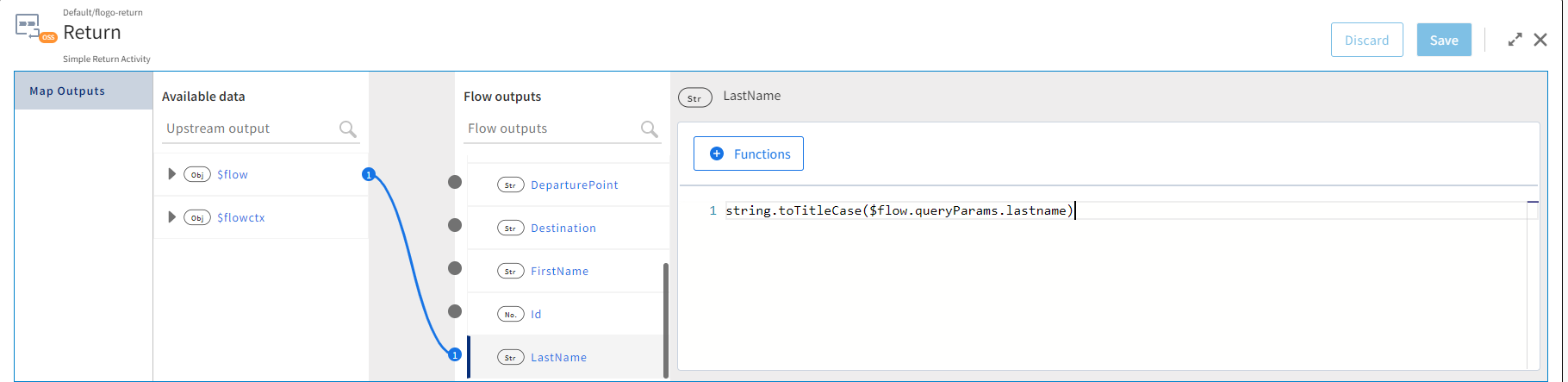 - Click LastName to map this field to the query parameter lastname. Before doing so, we can use a string function to capitalize the family name that is returned by our app. To do so, under Functions, expand the string and click toTitleCase(str). Once string.toTitleCase(str) is added to your box, select str to replace it with the query parameter. Expand $flow and then queryParams under Available data. Drag lastname and drop it in place of str. The text editor must look like this: