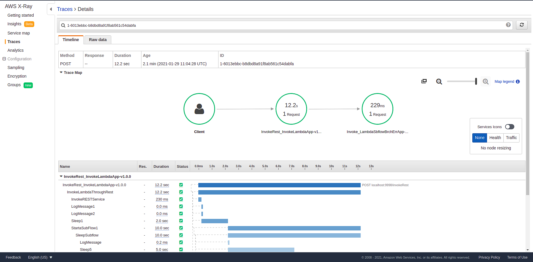 When you use AWS X-Ray for tracing, your app sends trace data to AWS X-Ray. X-Ray processes the data to generate a service map and searchable trace summaries. For each flow, subflow, and Activity, details such as execution time are displayed on the AWS X-Ray dashboard.