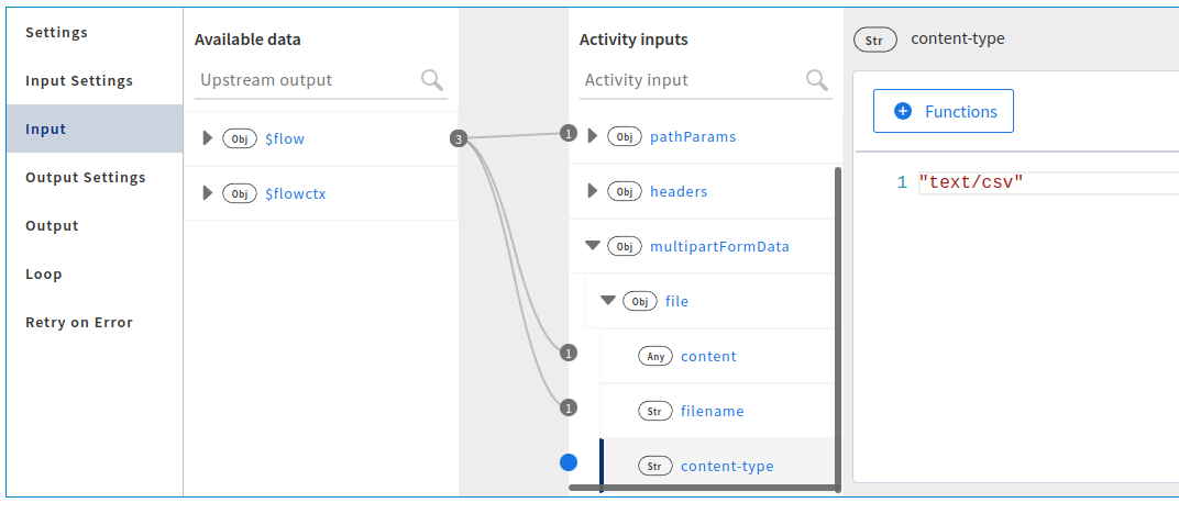 | multipartFormData | This field is visible if you select file or files type in the Multipart Data field on the Input Settings tab.
