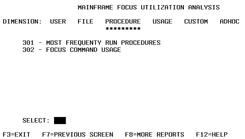 From FOCUS, issue the following command to display the report selection menu: