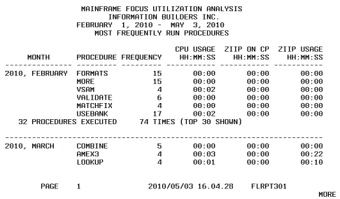 Re-sort by Duration, CPU, or EXCP to identify the most resource-intensive or widely used procedures. Run FLRPT301 for a summary of the top 30 procedures. |