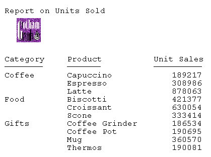 SET HTMLARCHIVE = OFF TABLE FILE GGSALES SUM UNITS BY CATEGORY BY PRODUCT ON TABLE SUBHEAD "Report on Units Sold" " " " " " " " " " " ON TABLE SET PAGE-NUM OFF ON TABLE HOLD FORMAT DHTML ON TABLE SET STYLE * TYPE=TABHEADING,IMAGE=c:\images\GOTHAM.GIF, POSITION=(.25 .25), SIZE=(.5 .5), $ ENDSTYLE END