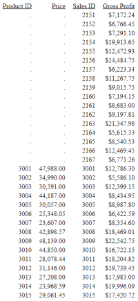 SET SHORTPATH = SQL JOIN RIGHT_OUTER ID_PRODUCT IN WF_PROD TAG T1 TO ALL ID_PRODUCT IN WF_SALES TAG T2 END TABLE FILE WF_PROD PRINT T1.ID_PRODUCT AS 'Product ID' PRICE_DOLLARS AS Price T2.ID_PRODUCT AS 'Sales ID' GROSS_PROFIT_US BY T1.ID_PRODUCT NOPRINT ON TABLE SET PAGE NOPAGE ON TABLE SET STYLE * GRID=OFF,$ ENDSTYLE END