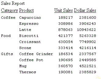 TABLE FILE GGSALES HEADING "Sales Report" ON TABLE HOLD FORMAT HTML SUM UNITS DOLLARS BY CATEGORY BY PRODUCT ON TABLE SET STYLE * TYPE=REPORT,FONT=DEFAULT-FIXED,$ TYPE=TITLE,FONT=DEFAULT-PROPORTIONAL,$ TYPE=HEADING,FONT=DEFAULT-PROPORTIONAL,$ TYPE=REPORT, GRID=OFF, $ ENDSTYLE END