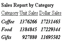 TABLE FILE GGSALES HEADING "Sales Report by Category" SUM UNITS DOLLARS BY CATEGORY ON TABLE HOLD FORMAT HTML ON TABLE SET STYLE * TYPE=REPORT, STYLE=BOLD+ITALIC, $ TYPE=HEADING, STYLE=-ITALIC, $ TYPE=TITLE, STYLE=-BOLD-ITALIC, $ TYPE=REPORT, GRID=OFF, $ ENDSTYLE END