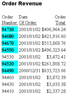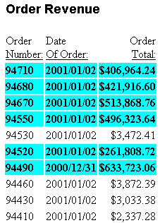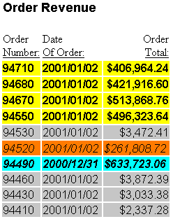 - Background color, which is also specified by the conditional declarations. It applies background color (silver) to any rows whose order total is less than or equal to $200,000, since those rows have not already been formatted by the conditional declarations.