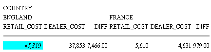In this request, the RETAIL_COST column under each value of COUNTRY may be printed in italic with an aqua background color, depending on the corresponding value of DIFF:
