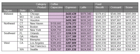 SET ACROSSTITLE=SIDE TABLE FILE GGSALES SUM DOLLARS/I8M AS '' BY REGION BY ST BY CITY ACROSS CATEGORY ACROSS PRODUCT WHERE CATEGORY EQ 'Coffee' OR 'Food'; ON TABLE SET PAGE-NUM NOPAGE ON TABLE NOTOTAL ON TABLE HOLD FORMAT PDF ON TABLE SET HTMLCSS ON ON TABLE SET STYLE * SQUEEZE=ON,UNITS=IN,ORIENTATION=PORTRAIT,$ TYPE=REPORT,FONT='ARIAL',SIZE=10,BORDER=LIGHT,$ TYPE=ACROSSTITLE,COLOR=WHITE, BACKCOLOR=GREY,$ TYPE=ACROSSVALUE,COLOR=WHITE, BACKCOLOR=GREY,$ TYPE=TITLE,COLOR=WHITE, BACKCOLOR=GREY,$ TYPE=DATA, ACROSSCOLUMN=DOLLARS, BACKCOLOR=THISTLE, WHEN=CATEGORY EQ 'Coffee',$ TYPE=DATA, ACROSSCOLUMN=DOLLARS, STYLE=BOLD+ITALIC, WHEN=A2 EQ 'Espresso', $ ENDSTYLE END