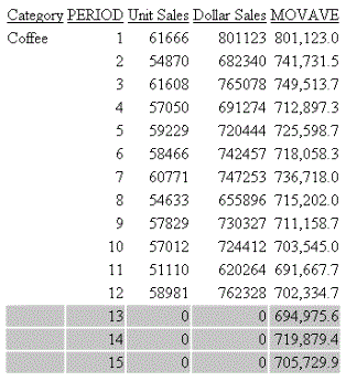 TABLE FILE GGSALES SUM UNITS DOLLARS BY CATEGORY BY PERIOD WHERE SYEAR EQ 97 AND CATEGORY EQ 'Coffee' ON PERIOD RECAP MOVAVE/D10.1= FORECAST(DOLLARS,1,3,'MOVAVE',3); ON TABLE SET PAGE-NUM OFF ON TABLE HOLD FORMAT HTML ON TABLE SET STYLE * TYPE=REPORT, GRID=OFF, $ TYPE=REPORT, BACKCOLOR=SILVER, WHEN=FORECAST, $ ENDSTYLE END