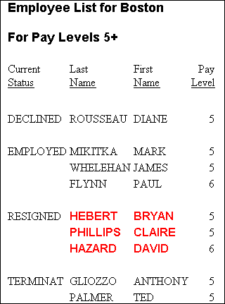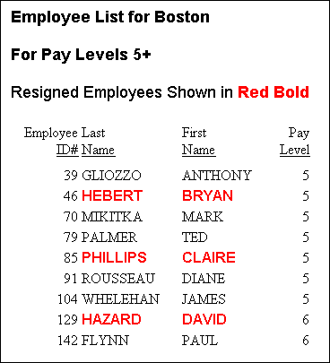 TABLE FILE CENTHR HEADING "Employee List for Boston" " " "For Pay Levels 5+" " " "Resigned Employees Shown in <0>Red Bold" " " PRINT LNAME FNAME PAYSCALE STATUS NOPRINT BY ID_NUM WHERE PLANT EQ 'BOS' AND PAYSCALE GE 5 ON TABLE SET PAGE-NUM OFF ON TABLE HOLD FORMAT HTML ON TABLE SET STYLESHEET * TYPE=REPORT, GRID=OFF, $ TYPE=DATA, COLUMN=LNAME, COLOR=RED, FONT='Arial', STYLE=BOLD, WHEN=STATUS EQ 'RESIGNED', $ TYPE=DATA, COLUMN=FNAME, COLOR=RED, FONT='Arial', STYLE=BOLD, WHEN=STATUS EQ 'RESIGNED', $TYPE=HEADING, FONT='Arial', STYLE=BOLD, SIZE=11, $ TYPE=HEADING, LINE=5, STYLE=-BOLD, $ TYPE=HEADING, LINE=5, ITEM=2, STYLE=BOLD, COLOR=RED, $ ENDSTYLE END
