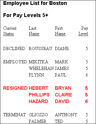 This example illustrates how to apply conditional formatting to a sort group. This report uses conditional formatting to draw attention to those employees who have resigned.