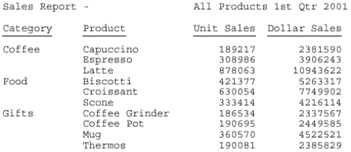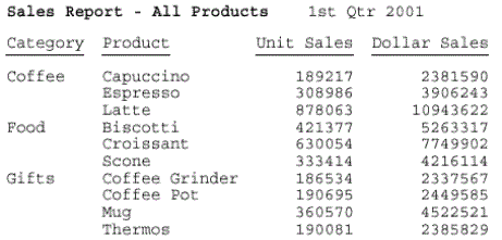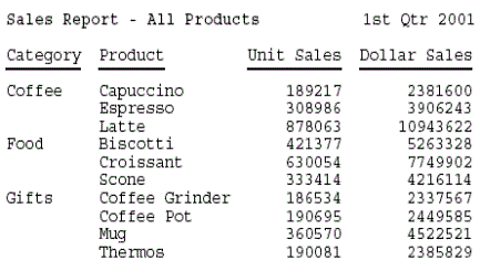 TABLE FILE GGSALES SUM UNITS DOLLARS BY CATEGORY BY PRODUCT ON TABLE SUBHEAD "Sales Report - <+0>All Products<+0> 1st Qtr 2001" " " ON TABLE SET PAGE-NUM OFF ON TABLE SET SQUEEZE ON ON TABLE HOLD FORMAT PDF ON TABLE SET STYLESHEET * TYPE = TABHEADING, OBJECT = TEXT, ITEM=1, SIZE = 12, STYLE = BOLD, $ TYPE = TABHEADING, OBJECT = TEXT, ITEM=2, STYLE = BOLD, $ TYPE = TABHEADING, OBJECT = TEXT, ITEM=3, POSITION = 3, $ ENDSTYLE END