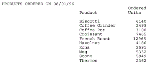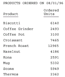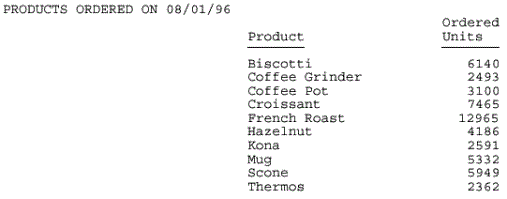 TABLE FILE GGORDER "PRODUCTS ORDERED ON 08/01/96" SUM QUANTITY BY PRODUCT_DESCRIPTION WHERE ORDER_DATE EQ '080196' ON TABLE SET PAGE-NUM OFF ON TABLE HOLD FORMAT PDF ON TABLE SET STYLE * TYPE=REPORT, COLUMN=PRODUCT_DESCRIPTION, POSITION=3, $ TYPE=REPORT, COLUMN=QUANTITY, POSITION=+2, $ ENDSTYLE END