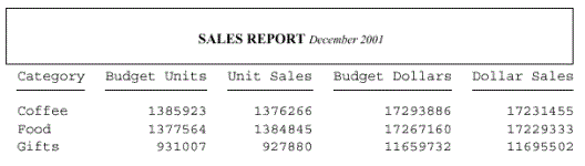 TABLE FILE GGSALES SUM BUDUNITS UNITS BUDDOLLARS DOLLARS BY CATEGORY ON TABLE SUBHEAD "SALES REPORT <+0>December 2001" ON TABLE SET PAGE-NUM OFF ON TABLE HOLD FORMAT PDF ON TABLE SET SQUEEZE ON ON TABLE SET STYLESHEET * TYPE = TABHEADING, GRID=ON, JUSTIFY=CENTER, TOPGAP=.25, BOTTOMGAP=.25, $ TYPE = TABHEADING, FONT='TIMES', SIZE=12, STYLE=BOLD, $ TYPE = TABHEADING, ITEM=2, SIZE=10, STYLE=ITALIC, $ ENDSTYLE END