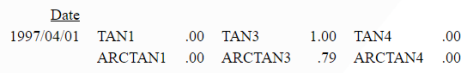 DEFINE FILE ggsales PI1 = PI(); PI4 = PI()/4; TAN1 = TAN(0); TAN3 = TAN(PI4); TAN4 = TAN(PI1); END TABLE FILE ggsales PRINT TAN1 TAN2 TAN3 TAN4 OVER COMPUTE ARCTAN1/D12.2 = ATAN(TAN1); ARCTAN3/D12.2 = ATAN(TAN3); ARCTAN4/D12.2 = ATAN(TAN4); BY DATE WHERE RECORDLIMIT EQ 1 ON TABLE SET PAGE NOLEAD ON TABLE SET STYLE * GRID=OFF,$ ENDSTYLE END