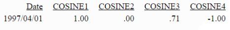 DEFINE FILE ggsales PI1 = PI(); PI2 = PI()/2; PI4 = PI()/4; END TABLE FILE ggsales PRINT COMPUTE COSINE1 = COS(0); COSINE2 = COS(PI2); COSINE3 = COS(PI4); COSINE4 = COS(PI1); BY DATE WHERE RECORDLIMIT EQ 1 ON TABLE SET PAGE NOLEAD ON TABLE SET STYLE * GRID=OFF,$ ENDSTYLE END