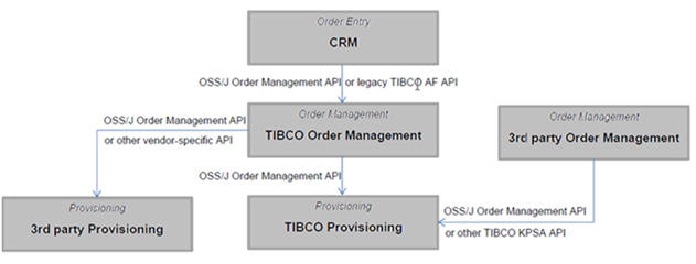 Standard The fulfillment conforms to the telecom OSS/J standard. The OSS/J for Order Management API is designed to foster development of interchangeable, interoperable components that can be rapidly and cost-effectively assembled into end-to-end Fulfillment solutions. This API specifies minimum requirements for Order Management Systems supporting end-to-end creation and management of Products, Services and Resources, including Work Orders. The following diagram depicts the API scope including interfaces for Customer Order Management implemented by TIBCO Fulfillment Order Management and Service Order Management implemented by TIBCO Fulfillment Provisioning: Figure 33. OSS/J Order Management Componentization
