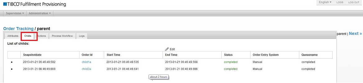Viewing Affiliated Orders TIBCO Fulfillment Provisioning Operation Administration and Maintenance displays the orders list. You can view the following: • The orders list of affiliated service orders for a parent service order. This list is available in the service order detail view. • Affiliated service order root page from the parent service order detail view by clicking on a service order identifier in the list of affiliated service orders. Figure 14. Tracking Parent Order