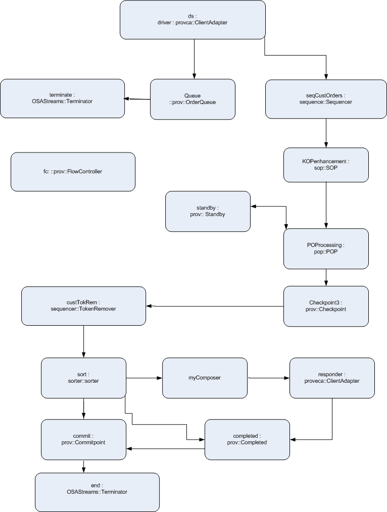 The service orders flowing through a stream are of the type ::prov::ServiceOrder, which is a subtype of ::OSAStreams::Message. The provisioning flow shown in the figure uses both general-purpose Streams modules and special-purpose Fulfillment Provisioning modules. The Fulfillment Provisioning modules are: