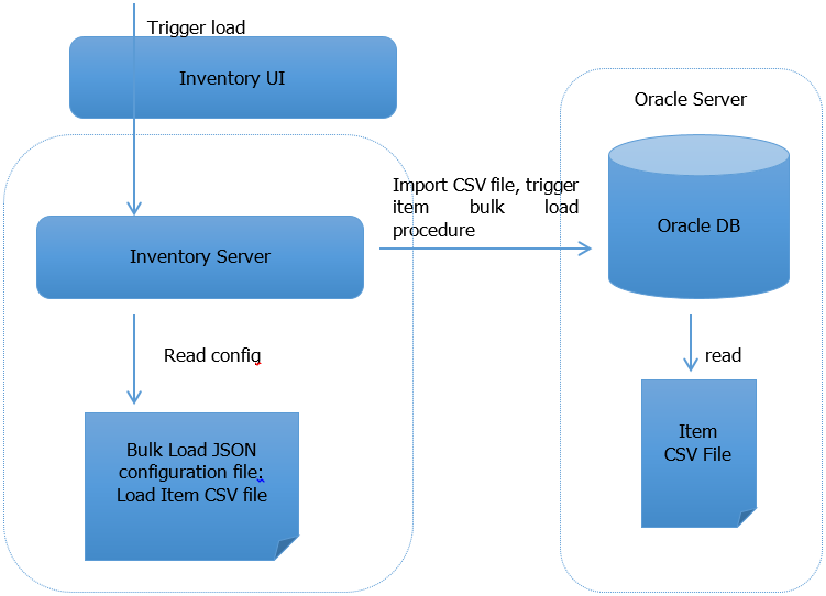 The Inventory Server will read the JSON configuration file. The JSON configuration file contains information about the CSV files that need to be loaded. The Inventory Server then triggers the read of CSV file by the Oracle server, and also triggers the conversion of the CSV file data into proper Inventory items. The Logs will be generated in the Oracle database and on the oracle server file system. These logs are accessible from the Inventory user interface bulk load pages.