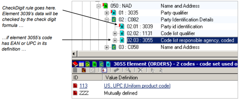 CheckDigit will check the last digit in the element 3039 if the data in element 3055 contains a code that has one of these character strings in its definition:
