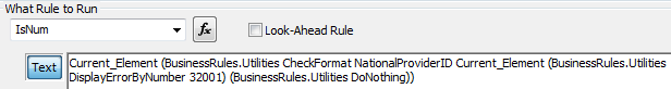 Example. This rule checks to see if the current element is entirely numeric. If so, it checks to see that it conforms to the NationalProviderID and displays error 32001 if it does not.