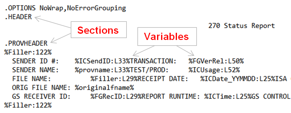 Templates also contain user-specified formatting options (.OPTIONS) and user-specified literal text (e.g., 270 Status Report).