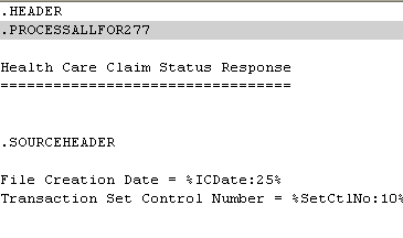 In the output file, the SOURCEHEADER section appears once for each 2000A loop in 270, 276, and 277 transactions. It begins with a line containing only: