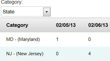After selecting, you see the volumes for each state. We assume that State is a partner filter set up by your administrator. This example has two divisions: New Jersey and Maryland. You can change category with the drop-down list above the chart.
