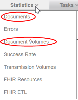 The Documents and Document Volumes pages show the number of documents of each type that were been processed during a timeframe of your choice.